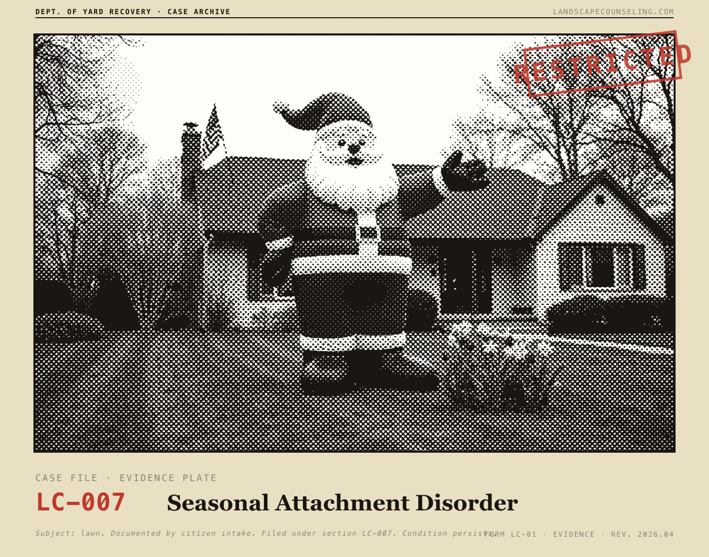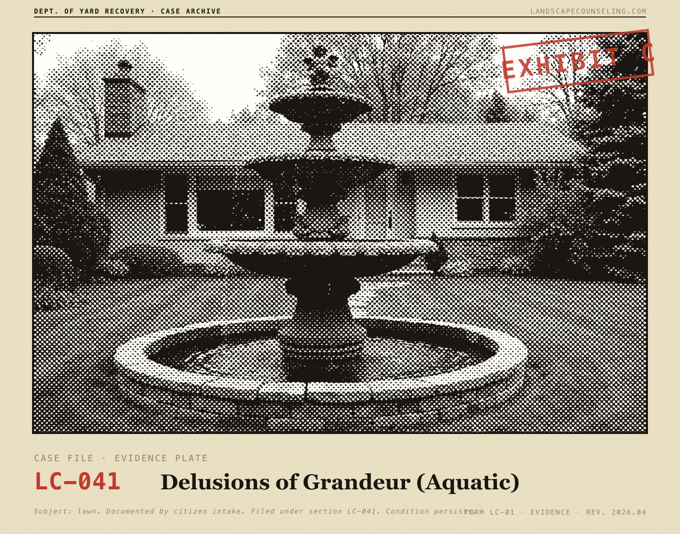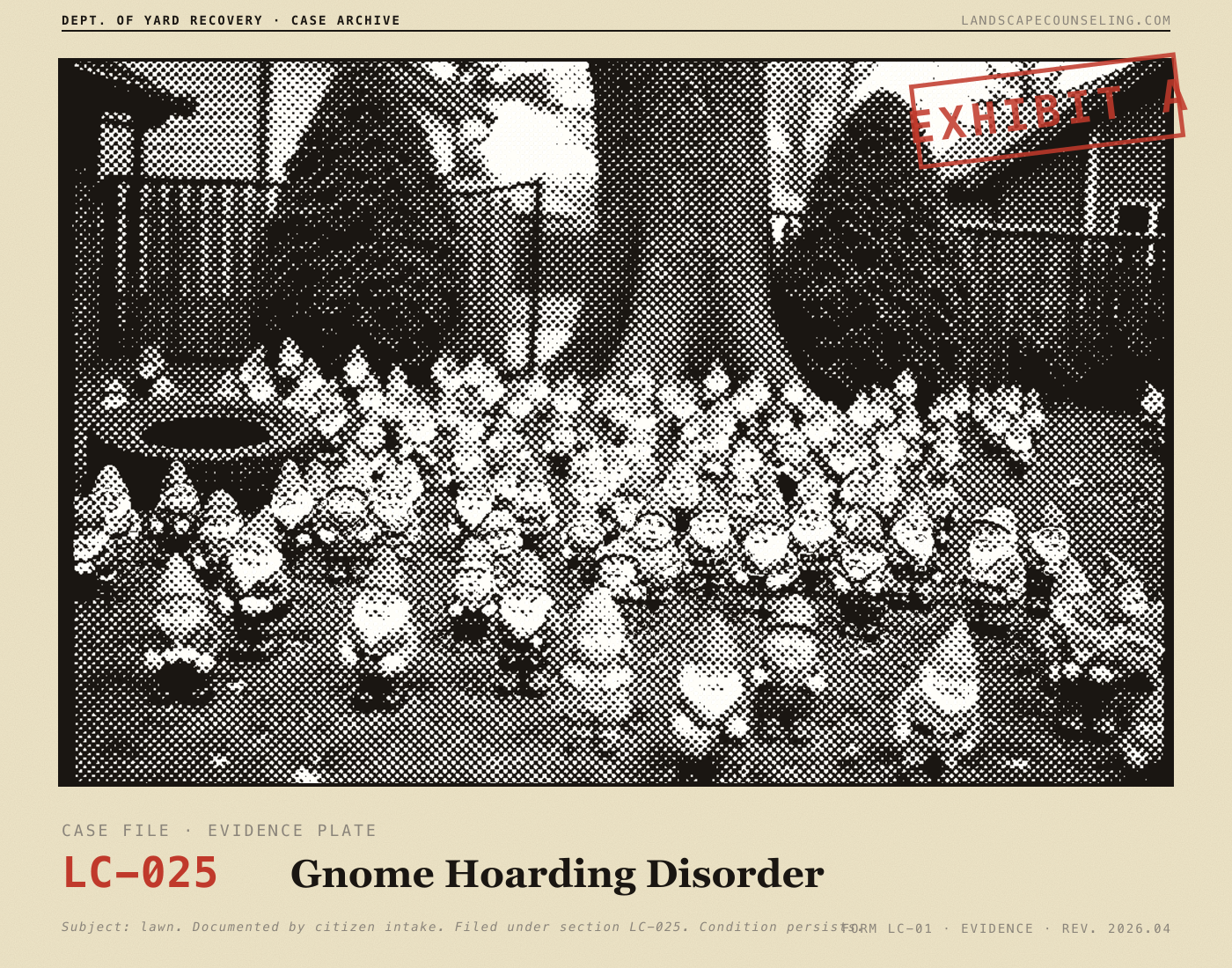 Submit your landscaping disasters for a professional diagnosis, a clinical severity rating, and a compassionate intervention letter your yard definitely can't read.